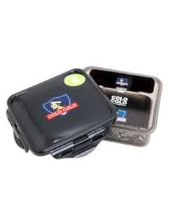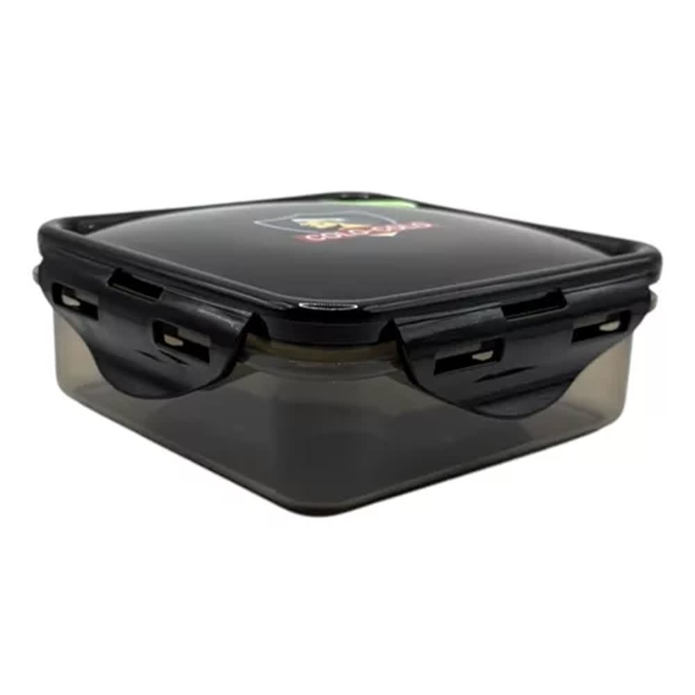 Caja cuadrada para tu snack o la porción justa de almuerzo. Plástico negro con el escudo al frente, tapa 4-clips y sello de silicona que impide cualquier fuga.