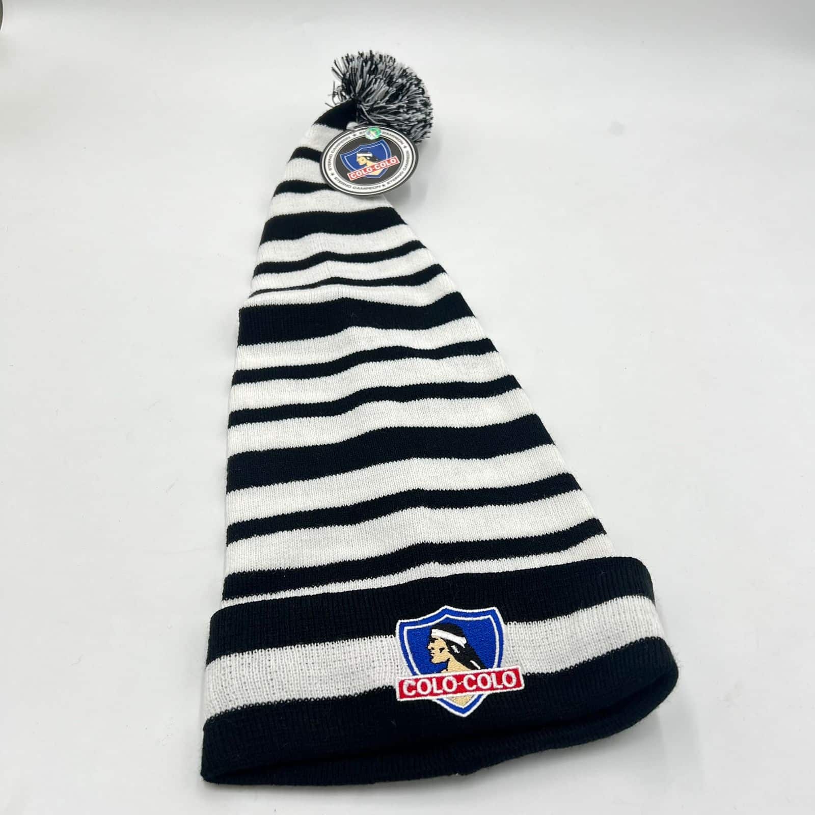 Luce las franjas clásicas del Cacique y mantén la cabeza abrigada. Tejido acrílico en negro-blanco, diseño largo tipo “duende” con pompón bicolor y escudo bordado al frente.
