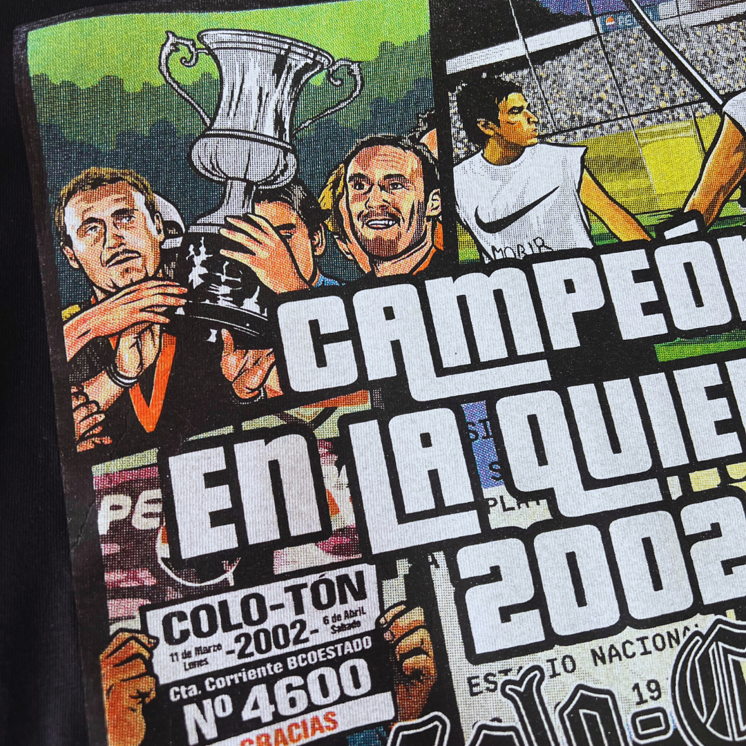 Homenajeamos al equipo del 2002 con esta polera que recuerda los momentos más inolvidables de ese año histórico: desde la quiebra que puso al club al límite, hasta la obtención de un torneo que quedó grabado para siempre en la memoria alba.